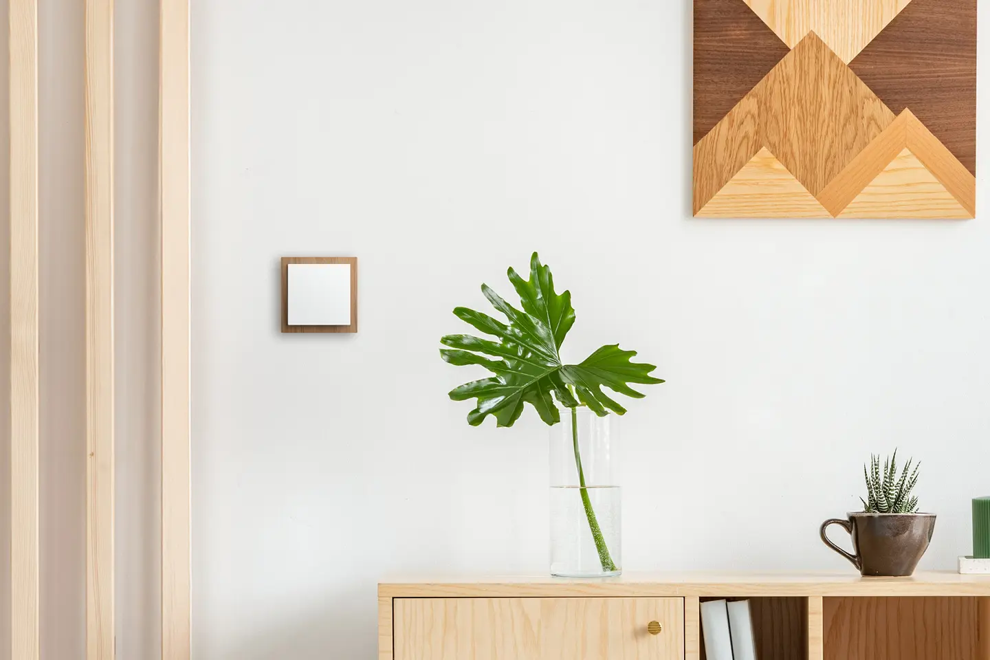 • Weißer Lichtschalter an einer grünen Wand, neben einer Pflanze platziert.