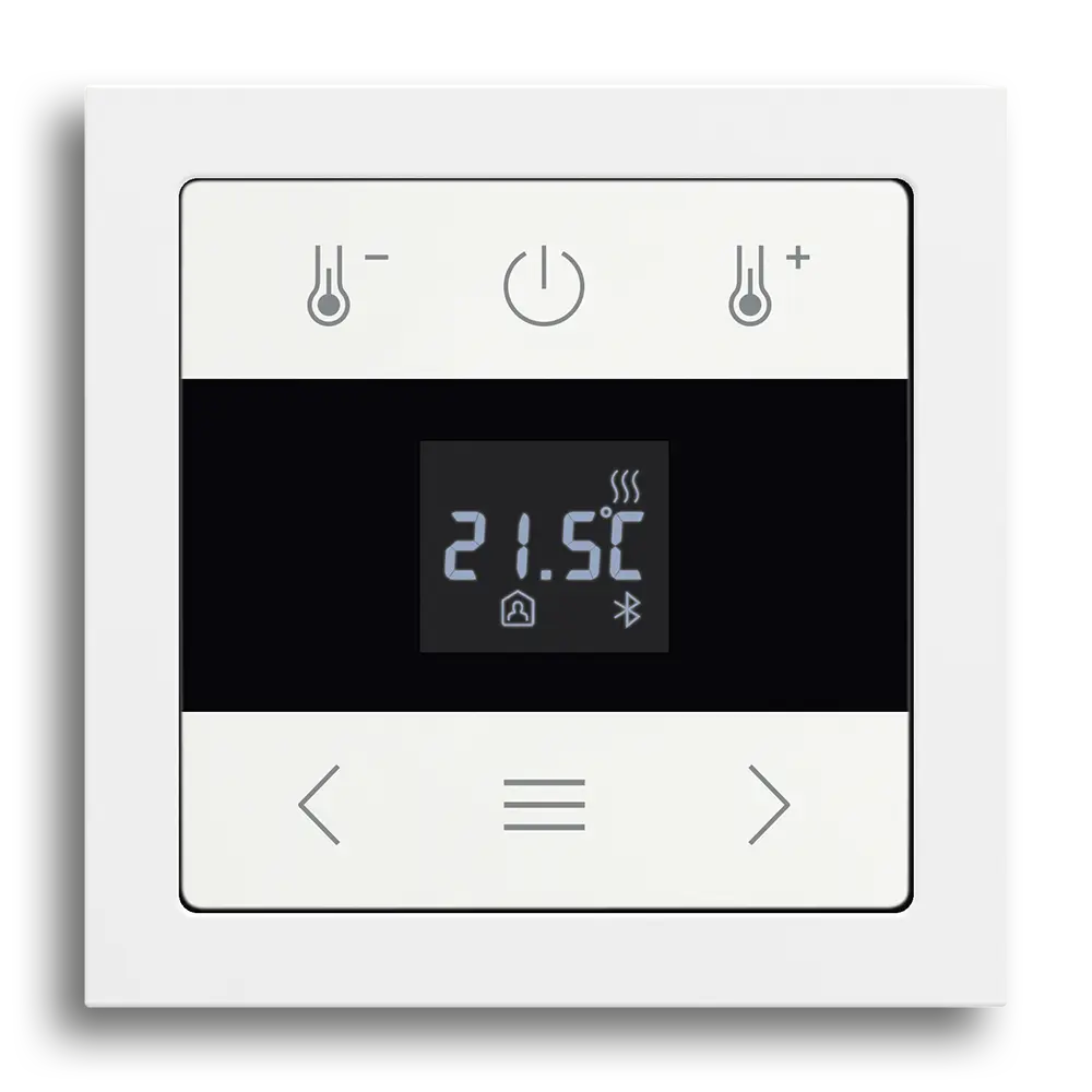 Der Raumtemperaturregler mit Display BT kombiniert die gewohnte Bedienung direkt am Regler mit der komfortablen Fernbedienung via App. Du kannst die Grundfunktionen wie Sollwert und Betriebsart vor Ort steuern und gleichzeitig mit der App erweiterte Funktionen wie Zeitsteuerung und individuelle Parametrierung bequem vom Sofa aus nutzen. Ideal für eine moderne und flexible Einzelraumregelung.